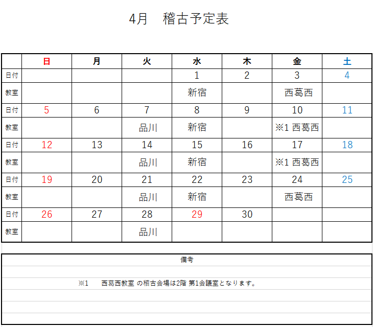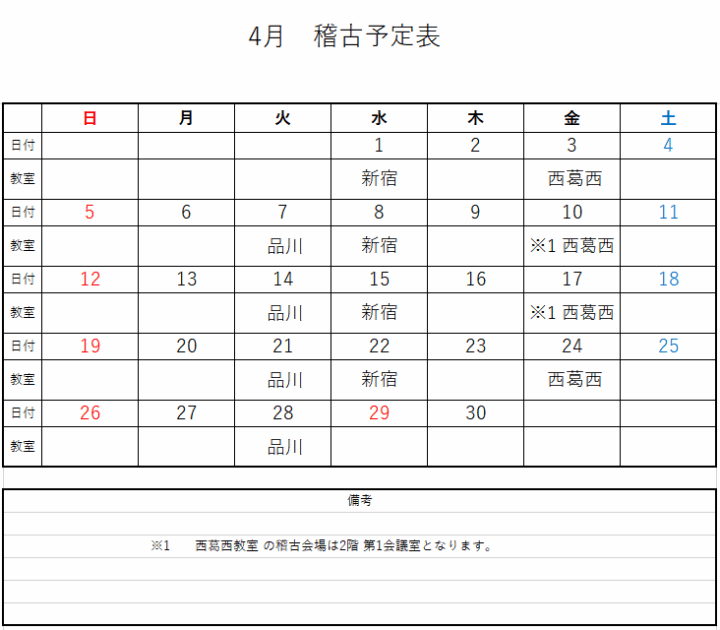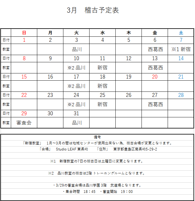※1 新宿教室の7日の稽古日は土曜日に変更となります。