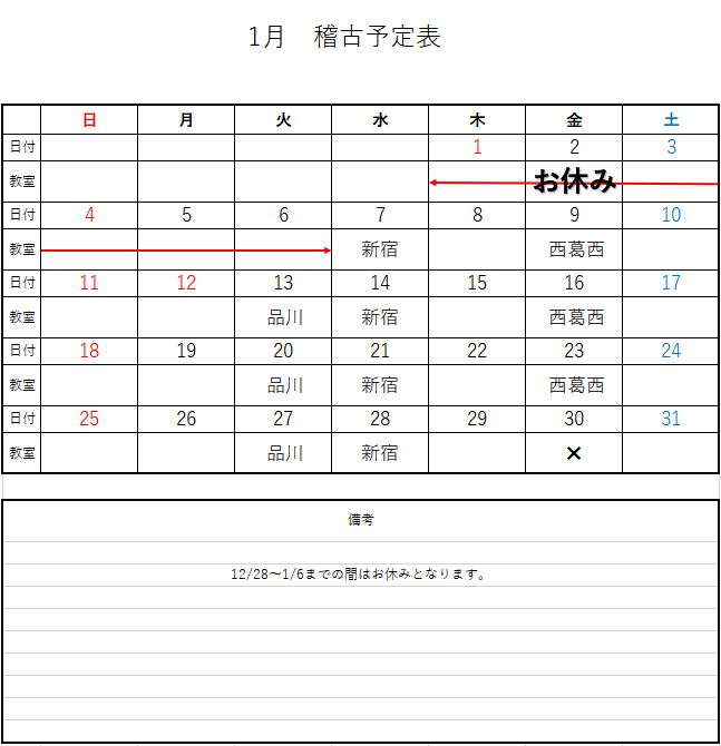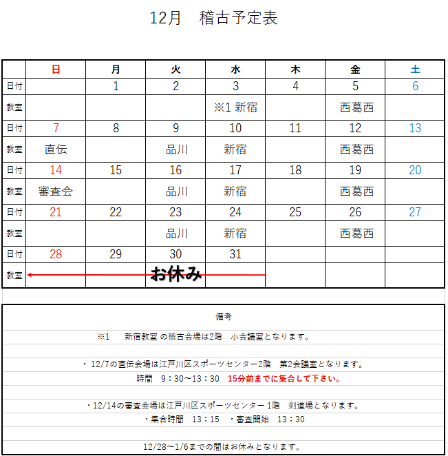12月予定表 【新宿教室】 ※1 新宿教室 の稽古会場は2階 小会議室となります。・ 12/7の直伝会場は江戸川区スポーツセンター2階 第2会議室となります。・時間 9:30~13:30 15分前までに集合して下さい。・12/14の審査会場は江戸川区スポーツセンター 1階 剣道場となります。・集合時間 13:15 ・審査開始 13:30・12/28~1/6までの間はお休みとなります。
